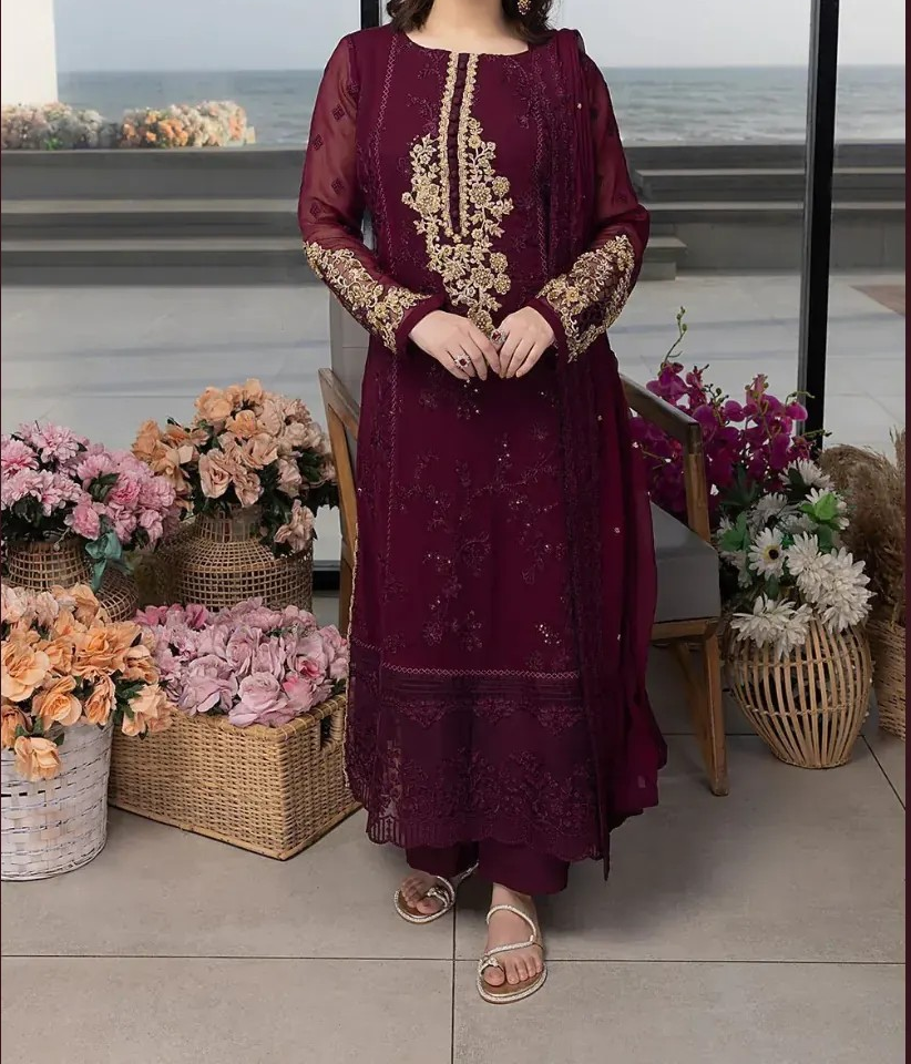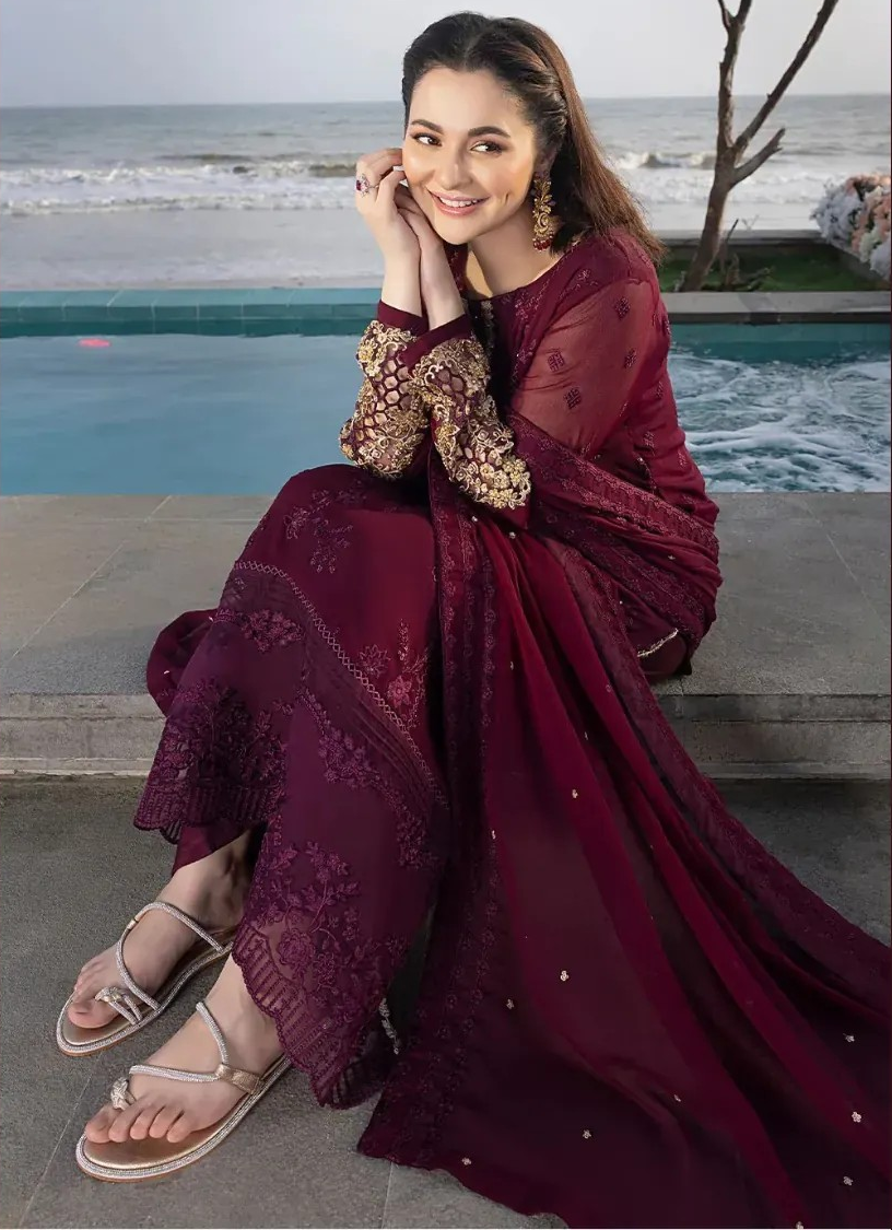 Step into luxury with AZURE’s chiffon embroidered unstitched 3-piece suit, crafted with timeless elegance and intricate details. The neckline is beautifully adorned with adda work and attached pearls,…