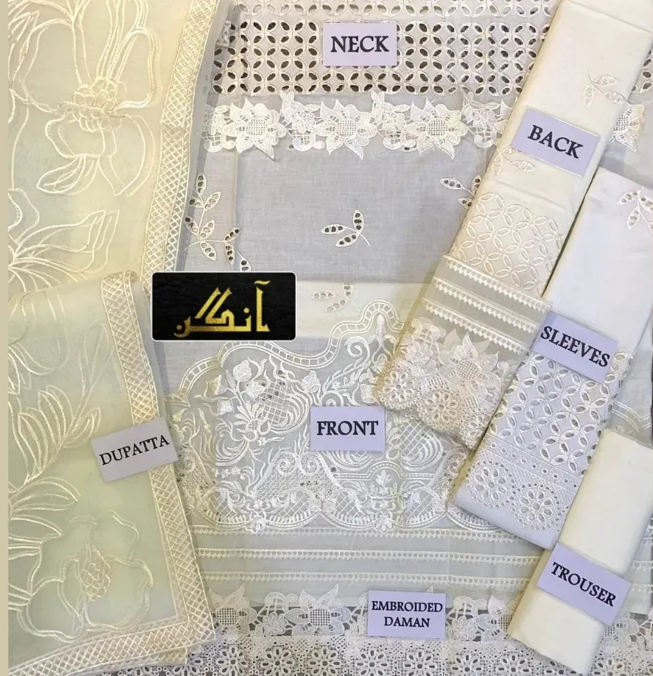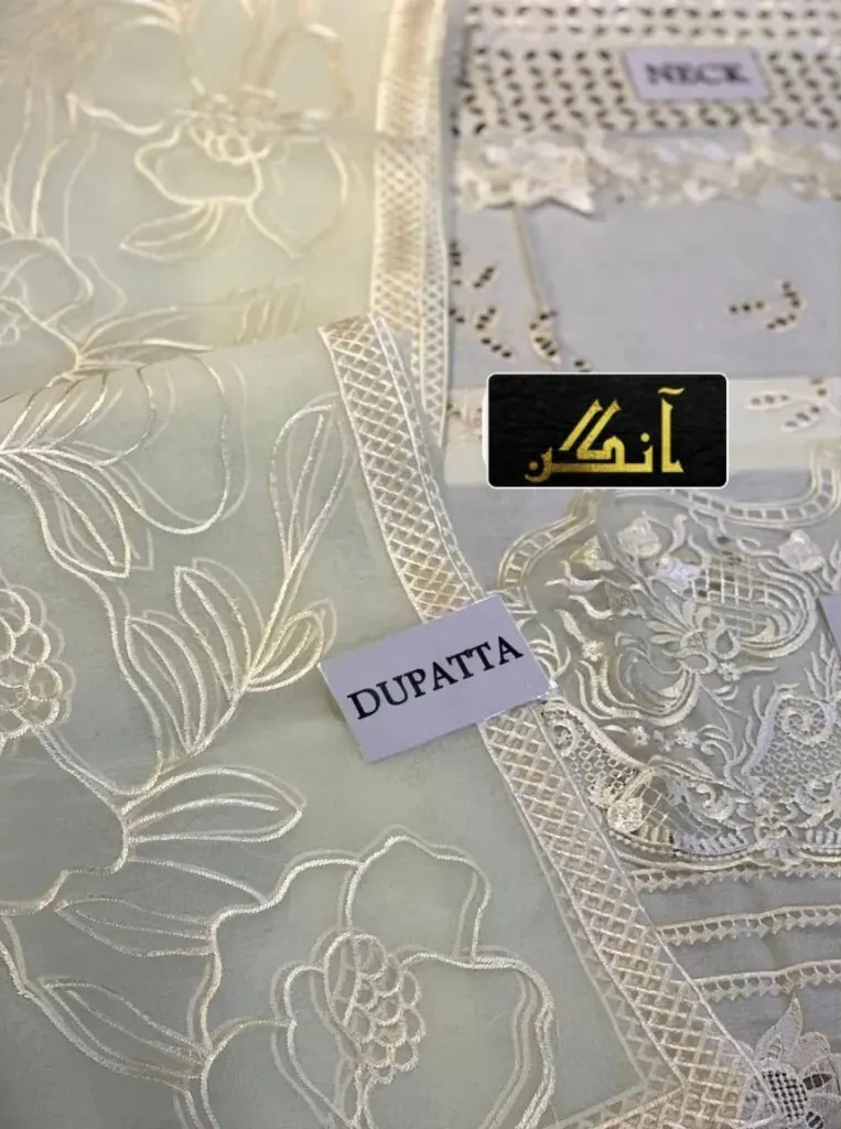 Embroidered Luxury Lawn Cotton Unstitched 3 Piece Suit – Organza Embroidered Dupatta & Elegant Lace Detailing 2025 Collection.