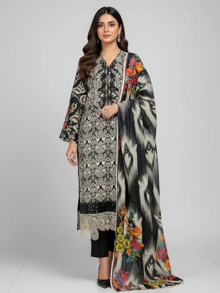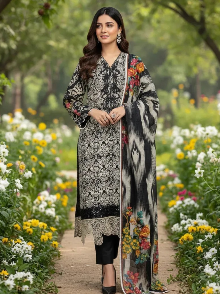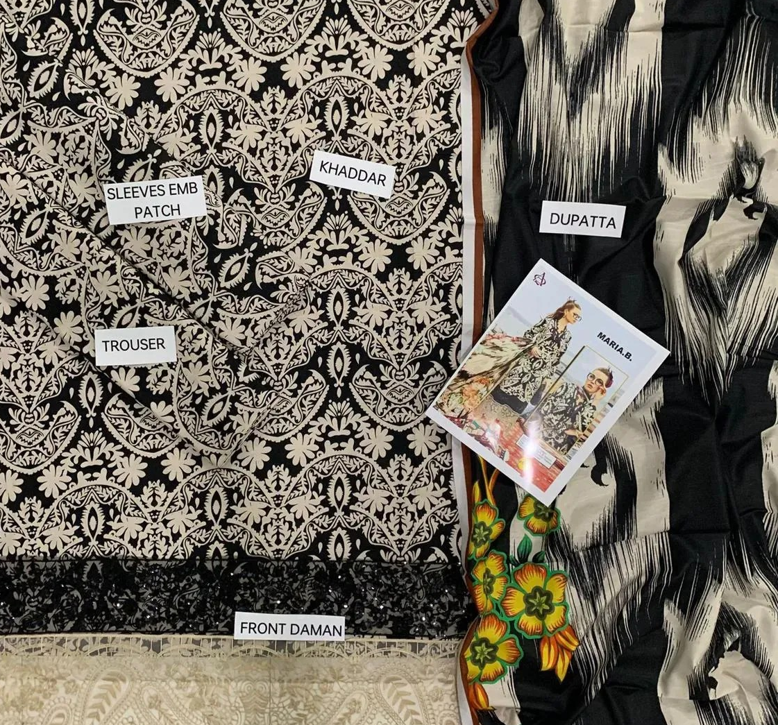 Maria B. Inspired Black & White Khaddar Suit with Embroidered Daman & Sleeves – Unstitched 3-Piece DressStep out in style with this gorgeous unstitched 3-piece Maria B. inspired suit.