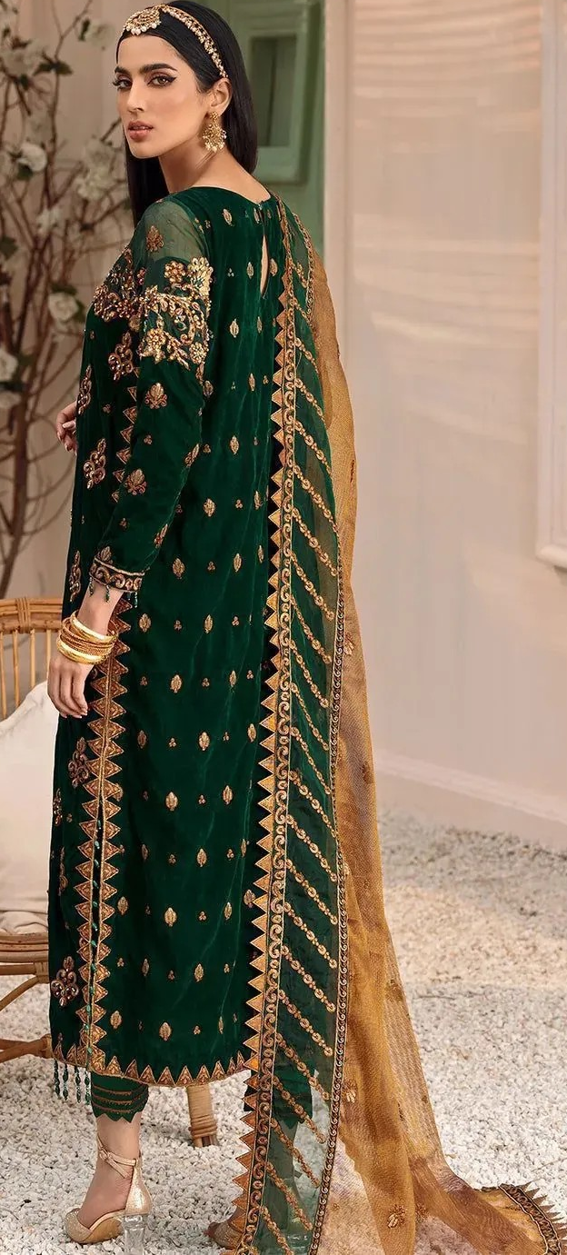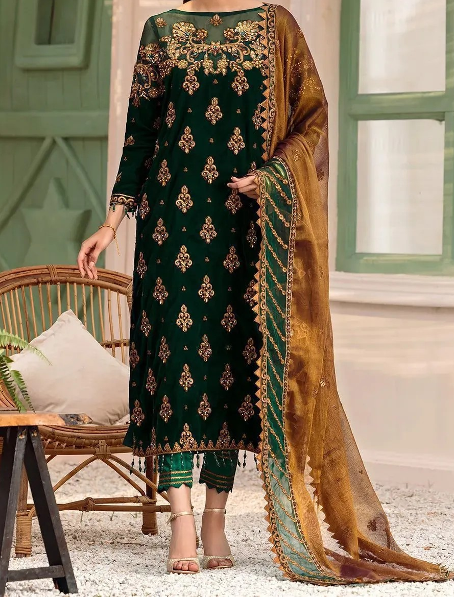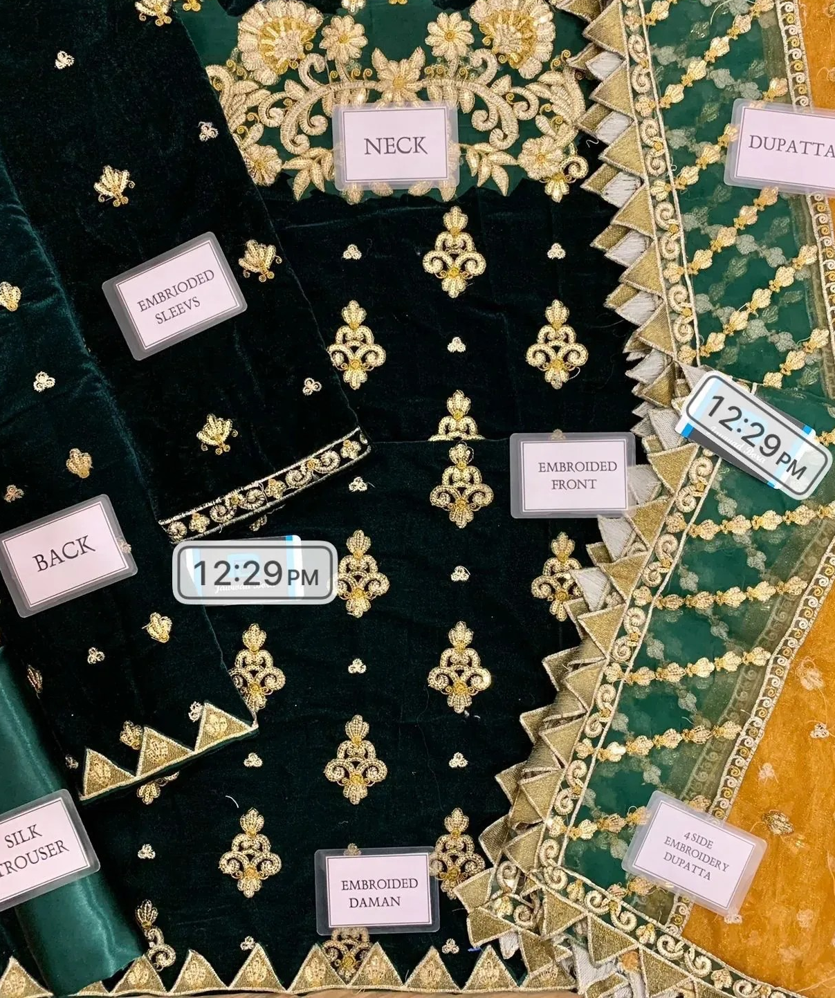 Velvet Embroidered Suit – Velvet Shirt with Net Dupatta & Silk Trouser