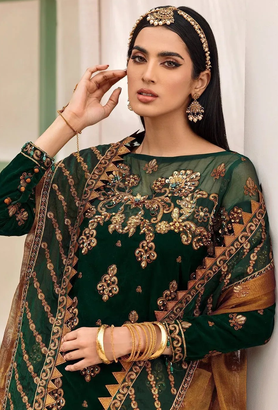 Velvet Embroidered – Velvet Shirt with Net Dupatta & Silk TrouserThis stunning master replica of the EMAAN ADEEL design captures the essence of luxury